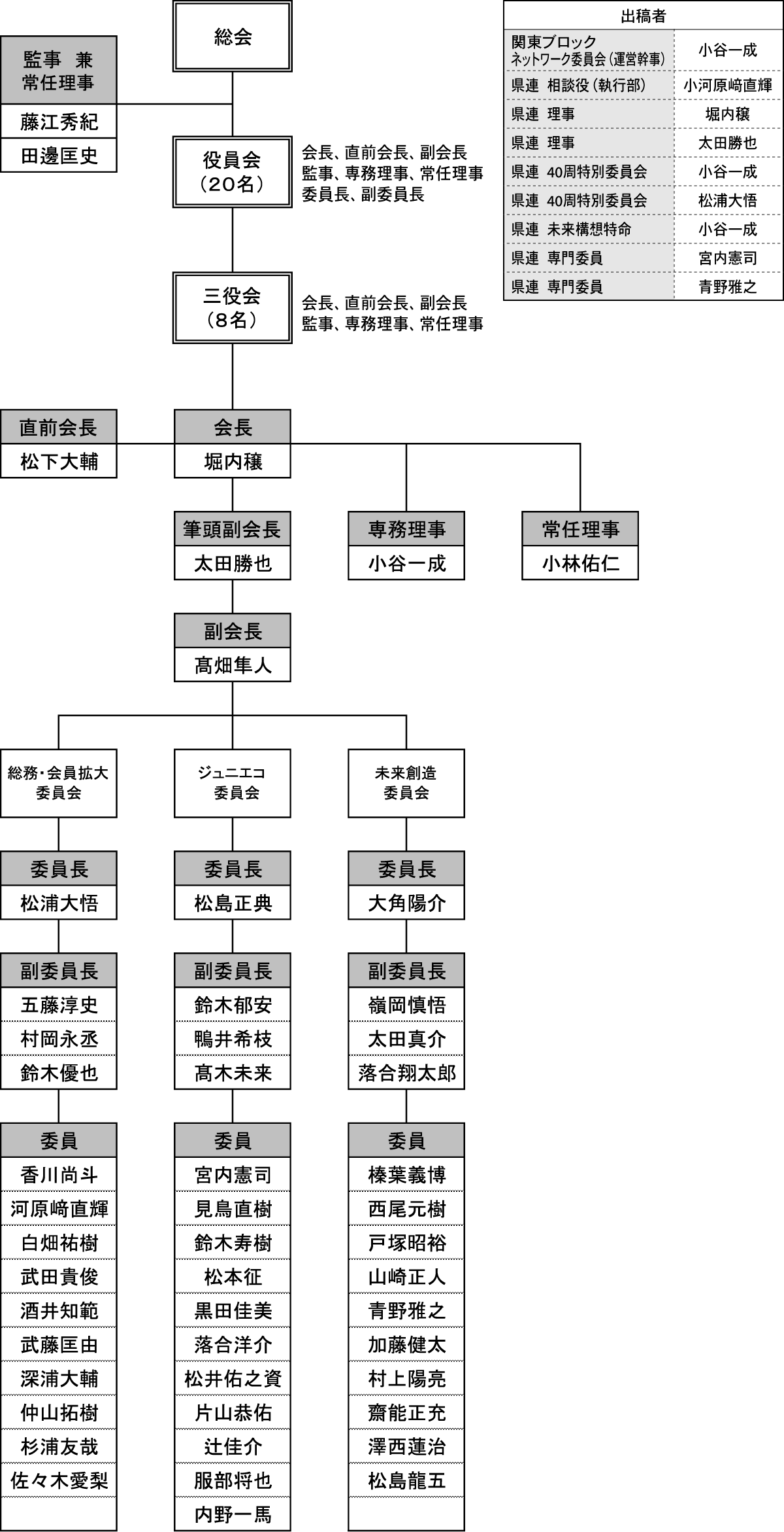 さて近年、全国の各単会が抱える問題の中で、“会員数の減少”や“出席(アクティブ)率の低下”があります。私達掛川YEGもまさに問題に直面しております。これまで掛川YEGの中核を担ってこられた頼れる先輩方の多くが令和6年度・7年度で卒業のため、在会メンバーの多くが、入会歴が浅くあまり事業を経験したことのないメンバーになります。今年度は副委員長の役職を中心に新しい顔ぶれの組織編成考えました。入会歴にとらわれず、なるべく多くのメンバーの皆様に役員を1年間経験していただき、未来への土台づくりをしていきたいと思います。